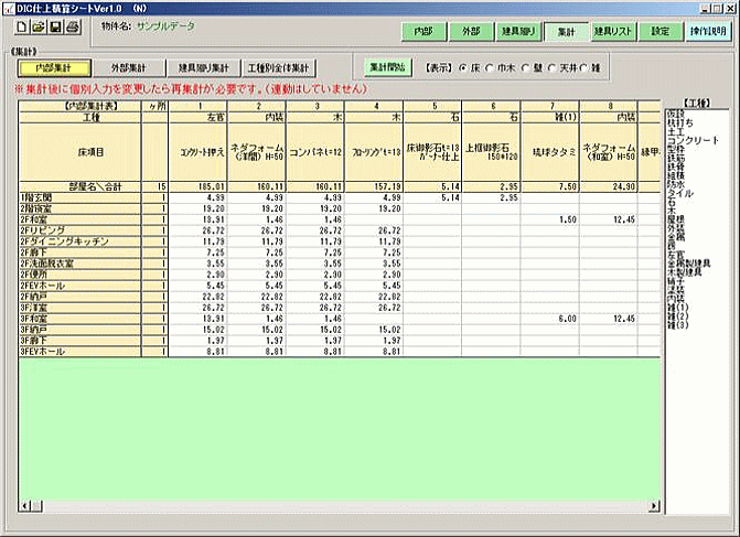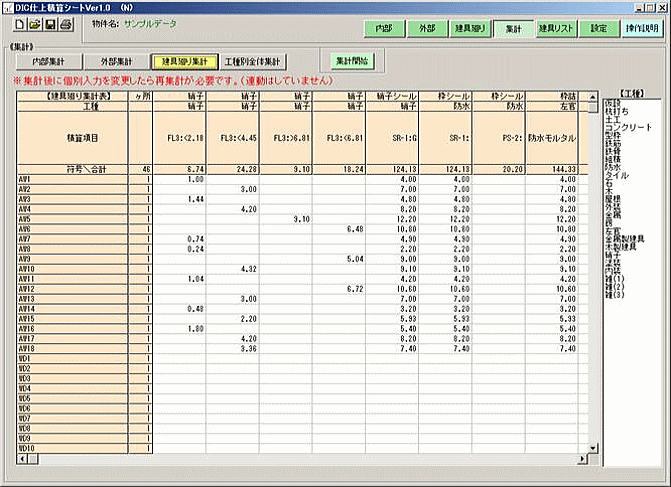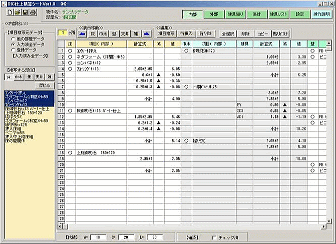 | Ver1.4 | ・印刷時に物件名、会社名を出力できるようにしました(設定に入力欄を新設) ・項目複写の状態でも計算式の入力可能にしました ・項目名に長い文字を多用すると集計データが表示しにくくなる件を修正 |